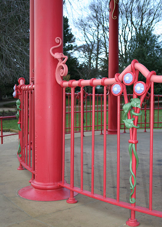 Although standard practice is to cast the capital decoration as part of the column, we instead applied a combination of forged & cast components for greater visual effect & volume. Continuing this approach into the balustrade attention is focused on the flowering posts, an abstract version of the horn blowing a flower design replicated from a nearby building. The three dimensional forgework was an important part of our proposal to create a distinctive bandstand aimed at appealing to & engaging the attention of people of all ages using the park.Inspired by historical fashions, the bandstand is brightly decorated using colours from the park’s newly compiled colour palette. This historically referenced colour scheme was established following archival research as, apart from one set of decorated tiles, there was limited evidence for paint analysis of previous colour within the park due to decay and vandalism. Historical fashions, influence and photographic evidence were all taken into consideration before the park’s colour policy was approved.