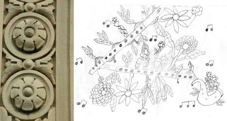 This concept had the added benefit of a direct reference to Saltaire’s heritage, with flowers being a distinctive decorative element within the local buildings. We expanded on this, assembling four capital designs, each based on a casual reference associating the instrument to the plant: