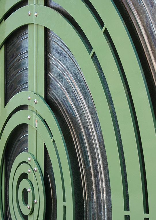 Located at Green Dragon Yard, The Georgian Theatre and Green Dragon Studios are at the heart of Stockton-on-Tees cultural quarter. The brief was for a creative design solution to link three public entrances on these two buildings. The Ironwork Studio’s concept was based on sound waves, as the Theatre is a music venue and the Green Dragon is a recording studio. We designed the entrances to be colourful and eye-catching, defining and promoting the venues and businesses to all who pass by. They are both lit at night, from within the reception areas, with light spilling out through the glazed panels to provide an inviting glow & let people know they are open. The transparent portion of the entry doors and sidelights is slumped glass, enabling us to incorporate the pattern made by the iron elements into the glass also. In specifying the work, the uses of the existing entrances were a prime consideration, as any design had to be functional, robust, maintainable, and the materials had to be fit for purpose and comply with relevant health and safety policies. All entrances were governed by public building regulations, with two being the principal disabled access and fire escape. Listed building consent was also required