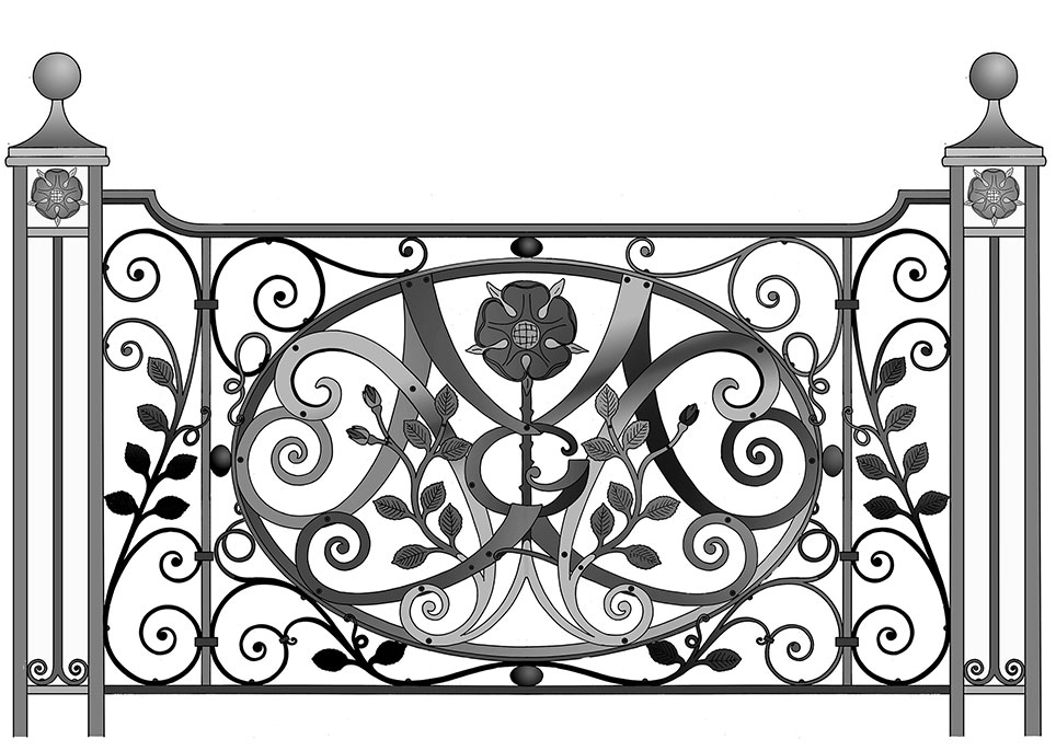 The brief was for a bespoke design for a main entrance, but one that blended with the feel and age of the property. The two large horizontal panels at the top of the stairs were to be decorated and therefore become the main focal point of the design, with a simpler approach to the rest of the balustrade. The current owners wished to personalise the design and therefore saw this as the opportunity to entwine a cypher (a secret code) linking the design directly to them and the substantial restorations that have taken part during their stewardship of the property. With one panel each they each included their initials, JGM for him and GAWM for her, each entwined with foliage to represent their nationalities, a thistle for Scotland and Rose for England. The finished design was handmade using traditional blacksmithing techniques to forge out the flowing shapes and give the finished piece a quality three dimensional finish.
